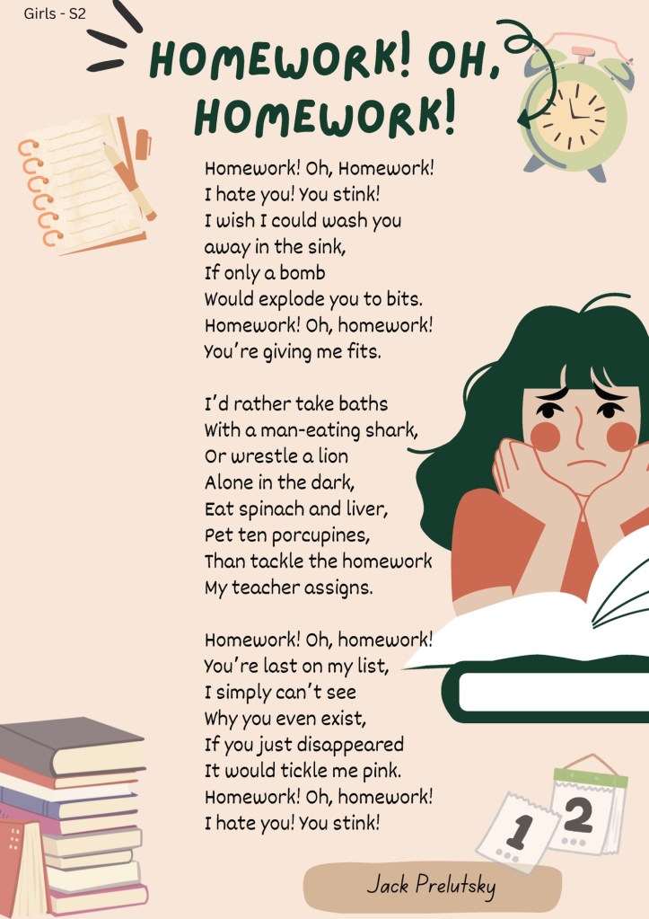 S2 Girls Whole poem Verse 1: ‘Homework! Oh, Homework!’ Verse 2: ‘I’d rather take …’ Verse 3: ‘Homework! Oh, Homework! You’re last …’